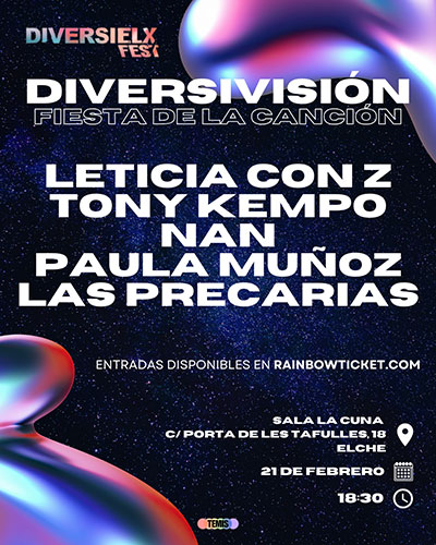 DiversiElx Festival nos trae Diversivisión, la fiesta de la canción que TU QUIERES. 5 Propuestas que te harán saltar de la emoción y disfrutar de música en directo: Leticia con Z,Tony Kempo, NAN, Paula Muñoz y Las Precarias. No te pierdas todo el talento y dedicación que ponen nuestros artistas en cada una de sus actuaciones.